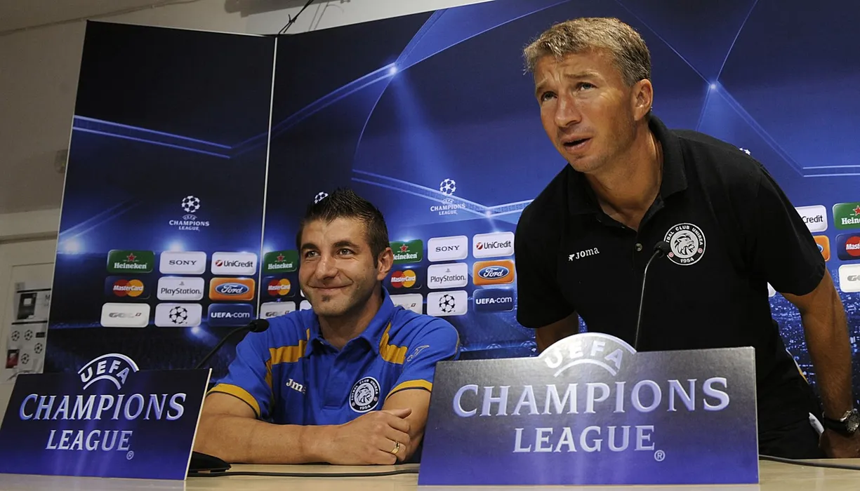 Urinea Urziceni's coach Dan Petrescu (R) and defender George Galamaz arrive for a press conference on September 15, 2009 at the Sanchez Pizjuam stadium, on the eve of their UEFA Champions league football match against Sevilla.,Image: 38496495, License: Rights-managed, Restrictions: , Model Release: no