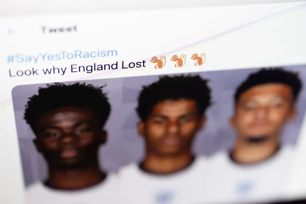 LONDON, ENGLAND - JULY 12: (EDITORS NOTE: Image contains offensive content) A tweet featuring racist content directed at the England football team is seen on July 12, 2021 in London, England. England manager Gareth Southgate, Prime Minister Boris Johnson, and the Football Association have issued statements condemning the racist abuse, largely on social media, directed at Black players on England's national football team after last night's loss to Italy in the UEFA European Football Championship. (Photo by Getty Images)