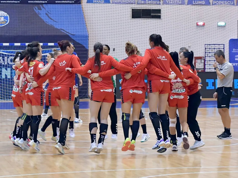 Bucurie a handbalistelor vâlcene după victoria obținută în meciul de handbal feminin dintre SCM Univeristatea Craiova și SCM Râmnicu Vâlcea, contând pentru Liga Florilor MOL, desfășurat în Sala Polivalentă din Craiova, miercuri 13 noiembrie 2024. © FOTO: Remus BADEA/SPORT PICTURES