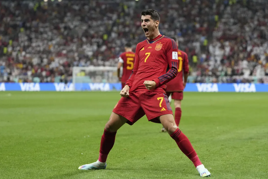 Spain's Alvaro Morata celebrates after scoring the opening goal during the World Cup group E soccer match between Spain and Germany, at the Al Bayt Stadium in Al Khor , Qatar, Sunday, Nov. 27, 2022. (AP Photo/Matthias Schrader)
