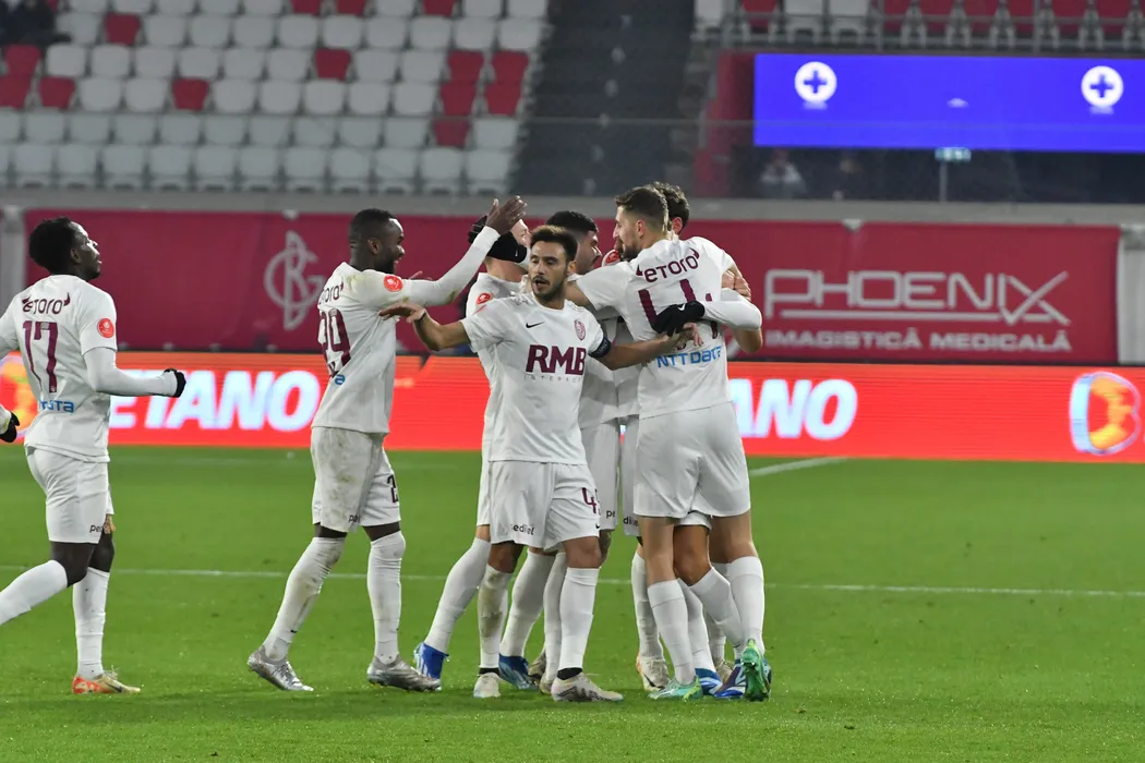 Fotbaliștii clujeni se bucura dupa un gol marcat în meciul de fotbal dintre FC Sepsi OSK Sfantu Gheorghe și FC CFR 1907 Cluj SA, contând pentru SuperLiga Superbet, desfășurat pe Stadionul SEPSI Arena OSK din Sfântu Gheorghe, duminică 17 decembrie 2023. © FOTO: Bogdan BALAS/SPORT PICTURES