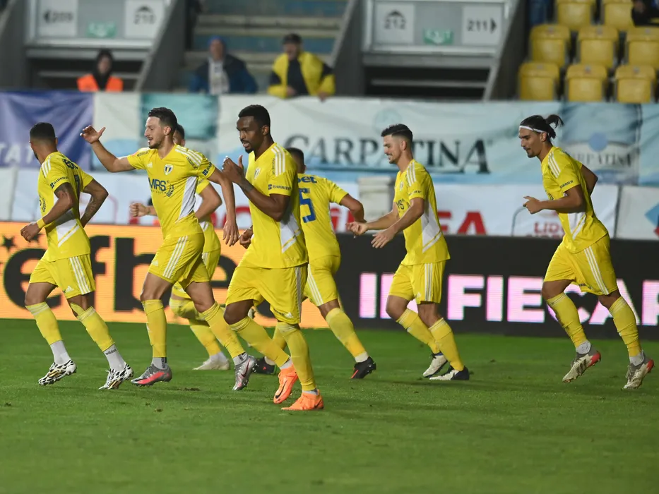 Bucurie a fotbalistilor ploiesteni dupa un gol marcat cu Lucian Mihai Dumitriu, Okechukwu Christian Irobiso si Marian Fernando Huja in meciul de fotbal dintre Petrolul Ploiesti si FC Botosani, contand pentru Superliga Superbet, desfasurat pe Stadionul Ilie Oana din Ploiesti, duminica 4 septembrie 2022. © FOTO:Razvan Pasarica/SPORT PICTURES