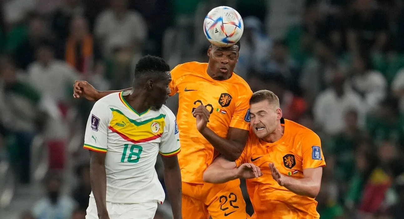 Denzel Dumfries of the Netherlands, center, jumps for a header with Senegal's Ismaila Sarr, left and Matthijs de Ligt of the Netherlands during the World Cup, group A soccer match between Senegal and Netherlands at the Al Thumama Stadium in Doha, Qatar, Monday, Nov. 21, 2022.,Image: 739155470, License: Rights-managed, Restrictions: This content is intended for editorial use only. For other uses, additional clearances may be required., Model Release: no