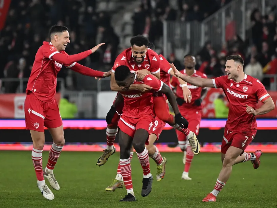 Vhakka Eddy Stelh Gnahore felicitat de Maxime James Sivis, Georgi Ventsislavov Milanov si Dennis Dorin Politic dupa un gol marcat in meciul de fotbal dintre Dinamo Bucuresti si AFC Hermannstadt Sibiu, contand pentru SuperLiga Superbet, desfasurat pe Stadionul Arcul de Triumf din Bucuresti, luni 3 martie 2025. © FOTO: Razvan Pasarica/SPORT PICTURES