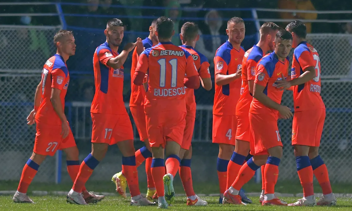 Bucurie a fotbalistilor stelisti dupa un gol marcat cu Darius Dumitru Olaru, Iulian Lucian Cristea si Andrei George Miron in meciul de fotbal dintre CS Hunedoara si FCSB, contand pentru Cupa Romaniei, desfasurat pe Stadionul Michael Klein din Hunedoara, miercuri 22 septembrie 2021. © FOTO:Razvan Pasarica/SPORT PICTURES