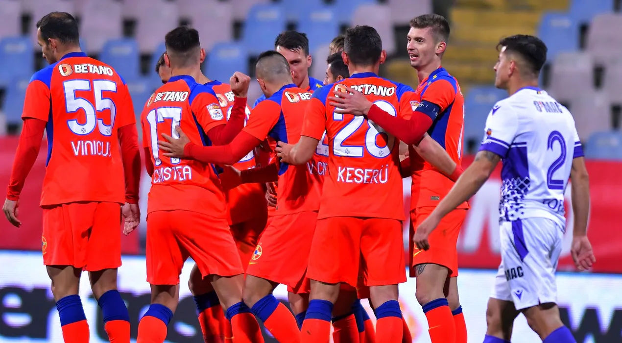 Bucurie a fotbalistilor stelisti dupa un gol marcat cu Paulo Vinicius De Souza Nascimento si Florin Lucian Tanase in meciul de fotbal dintre FCSB si FC Arges, contand pentru Liga 1 Casa Pariurilor, desfasurat pe Stadionul Gloria din Buzau, duminica 31 octombrie 2021. © FOTO:Razvan Pasarica/SPORT PICTURES