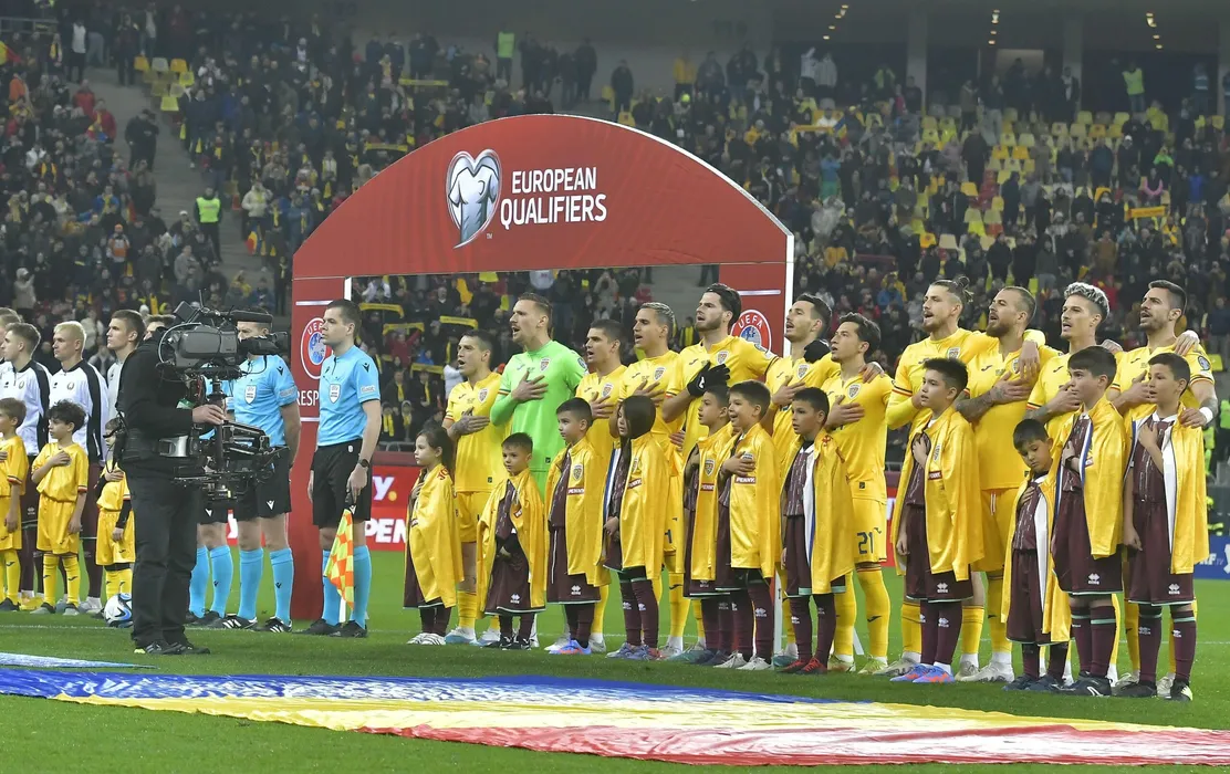 Fotbalistii celor doua echipa la startul meciului de fotbal dintre Romania si Belarus, din cadrul preliminariilor Campionatului European 2024, desfasurat pe Arena Nationala, marti 28 martie 2023. © FOTO:Razvan Pasarica/SPORT PICTURES