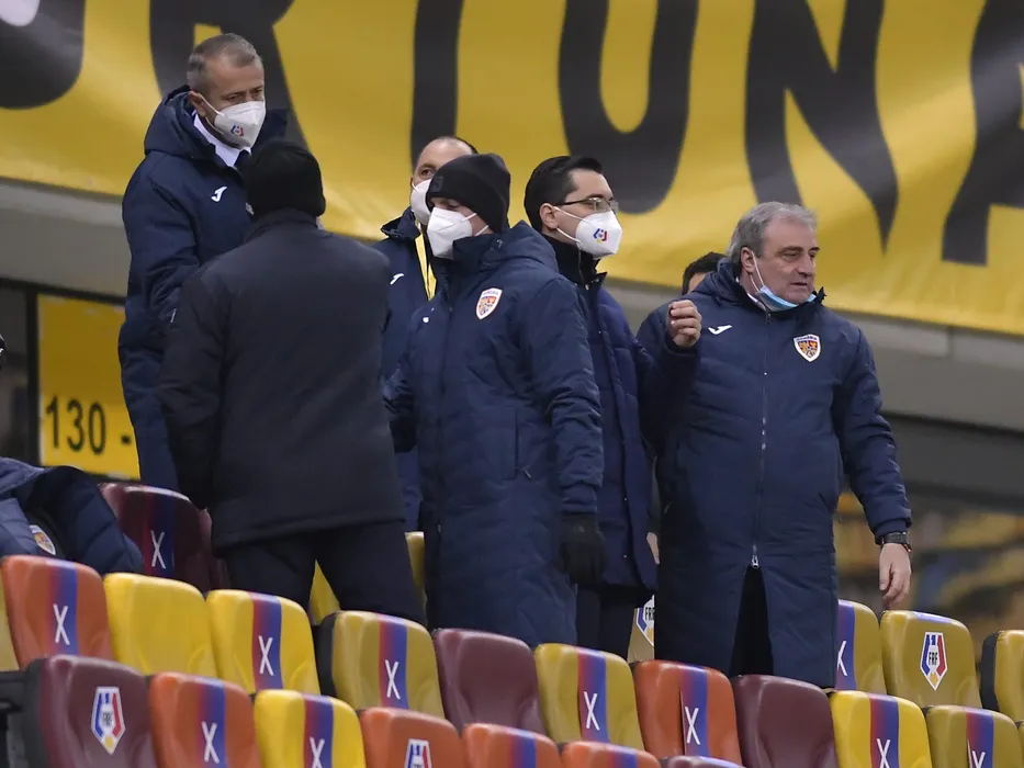 Gabriel Bodescu, Razvan Burleanu si Mihai Stoichita bucurosi dupa meciul de fotbal dintre Romania si Macedonia de Nord, din cadrul Preliminariilor Campionatului Mondial 2022, desfasurat fara spectatori pe Arena Nationala din Bucuresti, joi 25 martie 2021. © FOTO:Razvan Pasarica/SPORT PICTURES