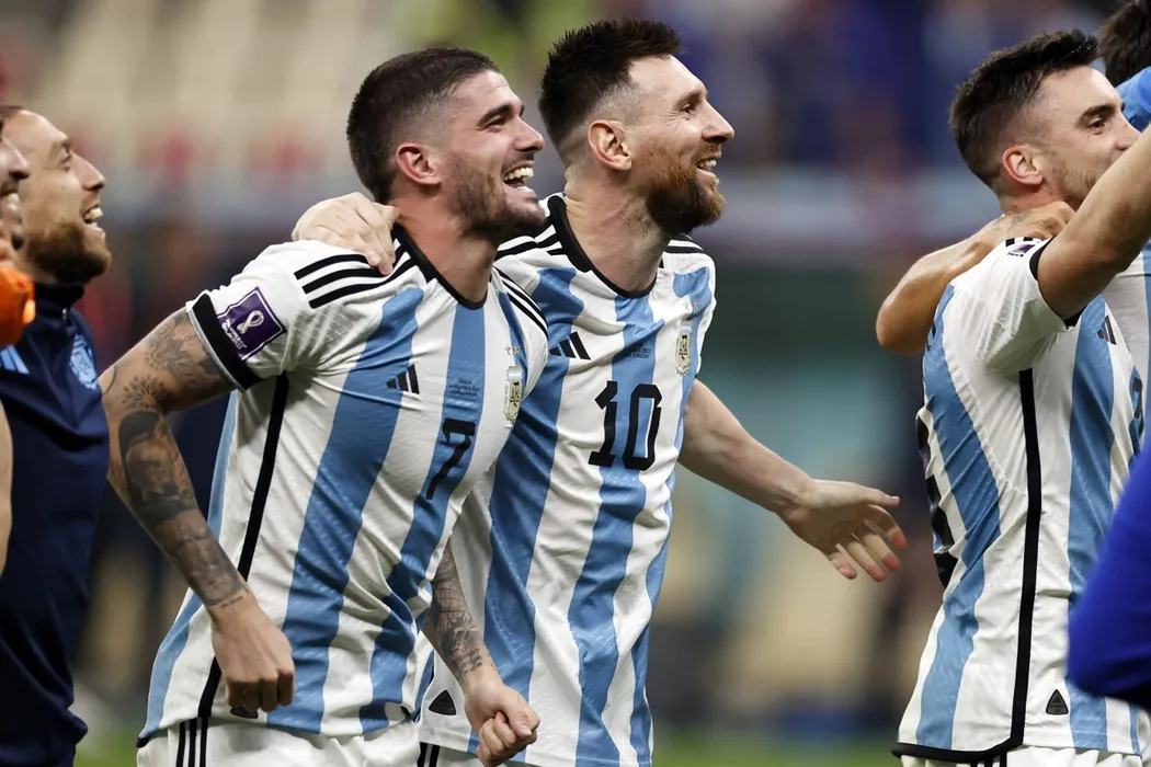 AL DAAYEN - (lr) Rodrigo De Paul of Argentina, Lionel Messi of Argentina celebrate victory after the FIFA World Cup Qatar 2022 Semifinal match between Argentina and Croatia at Lusail Stadium on December 13, 2022 in Al Daayen, Qatar. "Argentina v Croatia: Semi Final", FIFA World Cup Qatar 2022 - 13 Dec 2022,Image: 744420868, License: Rights-managed, Restrictions: , Model Release: no