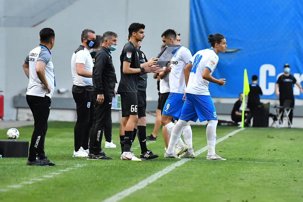 Atanas Ioan Trica, fiul antrenorului Eugen Trica si nepotul lui Ilie Balaci (D), intra pe terenul de joc in timpul meciului de fotbal dintre echipele Universitatea Craiova si Academica Clinceni, din etapa 10 a play-off-ului Ligii 1, disputat pe stadionul Ion Oblemenco din Craiova, miercuri, 26 mai 2021. REMUS BADEA / MEDIAFAX FOTO