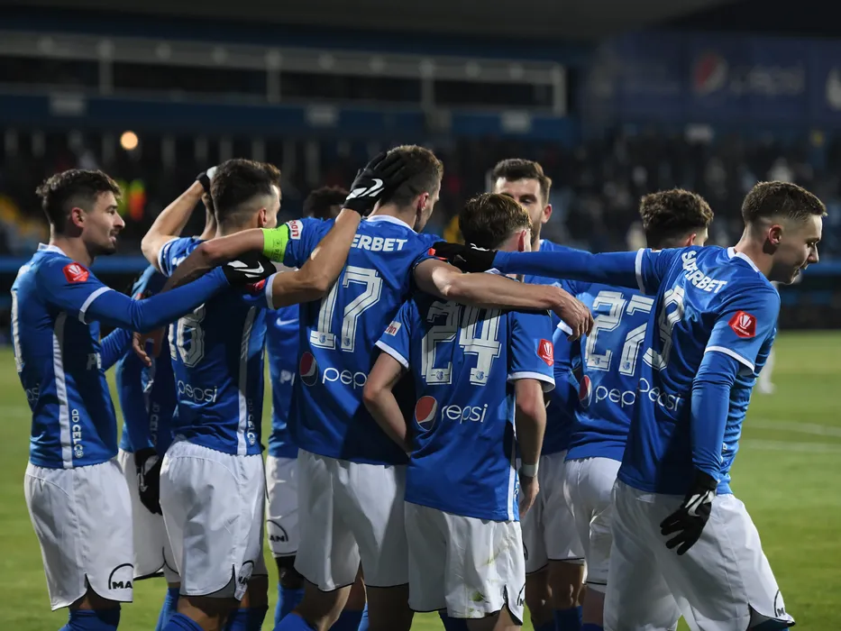 Bucurie a fotbalistilor constanteni dupa un gol marcatcu Vladut Calin Morar si Louis Munteanu in meciul de fotbal dintre Farul Constanta si Universitatea Craiova, contand pentru Superliga Superbet, desfasurat pe Stadionul central al Academiei Gheorghe Hagi din Ovidiu, luni 6 februarie 2023. © FOTO:Razvan Pasarica/SPORT PICTURES