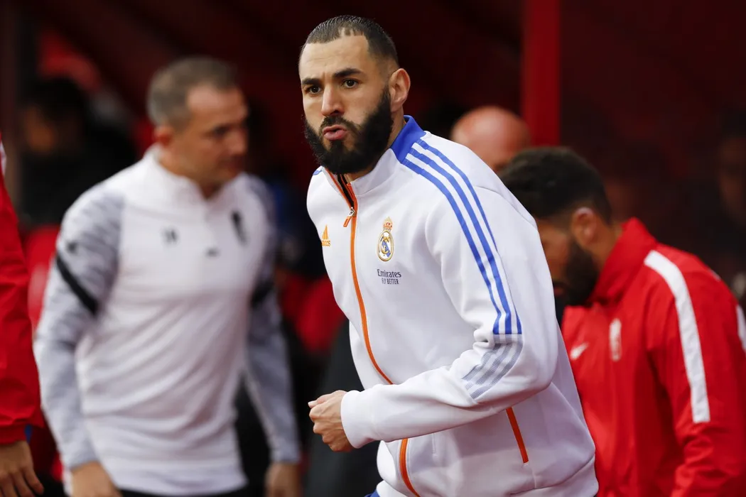 Karim Benzema, of Real Madrid during the La Liga match between Granada CF and Real Madrid CF at Nuevo Los Carmenes Stadium on November 21, 2021 in Granada, Spain.