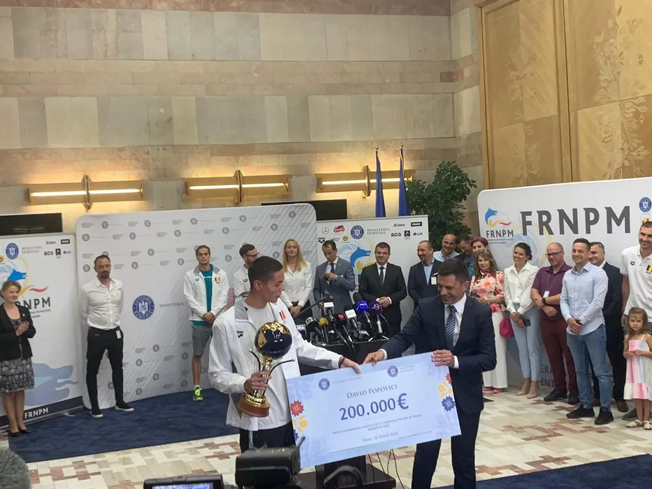 Eduard Novak i-a înmânat cecul de 200.000 de euro lui David Popovici: „A devenit o stea a României!”