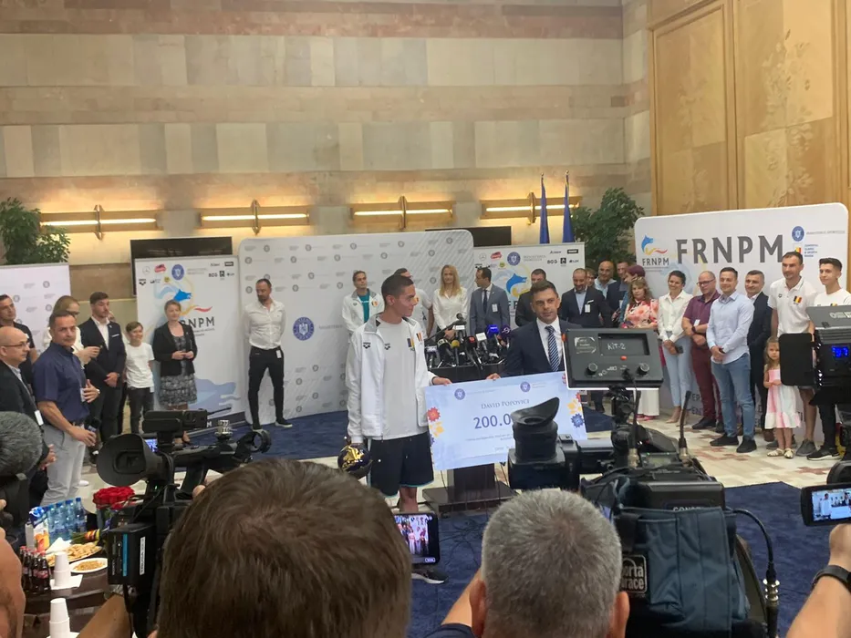 Eduard Novak i-a înmânat cecul de 200.000 de euro lui David Popovici: „A devenit o stea a României!”
