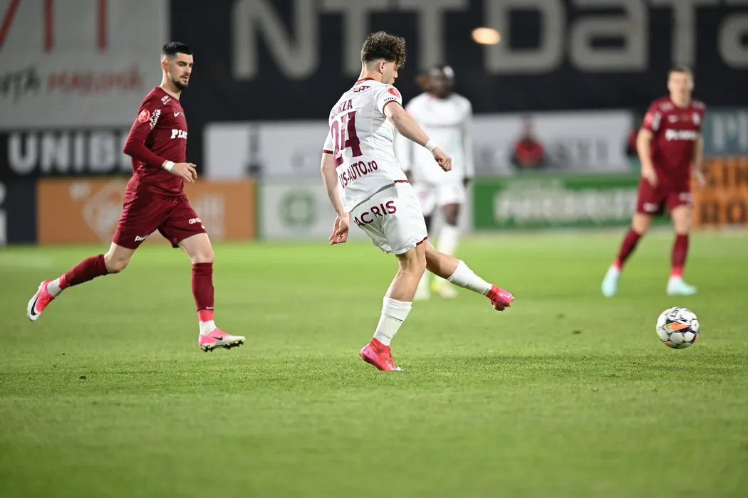 Sebastian Andrei Borza si Meriton Korenica in meciul de fotbal dintre FC CFR 1907 Cluj si FC Rapid 1923 Bucuresti, contand pentru Superliga Superbet - Play-Off, desfasurat pe Stadionul Dr.Constantin Radulescu din Cluj-Napoca, luni 14 aprilie 2025. © FOTO: Flaviu Buboi/SPORT PICTURES