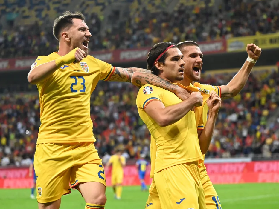 Bucurie a fotbalistilor romani dupa un gol marcat cu Deian Sorescu, Ianis Hagi si Daniel Birligea in meciul de fotbal dintre Romania si Andorra, din cadrul preliminariilor Campionatului European 2024, desfasurat pe Arena Nationala, duminica 15 octombrie 2023. © FOTO:Razvan Pasarica/SPORT PICTURES
