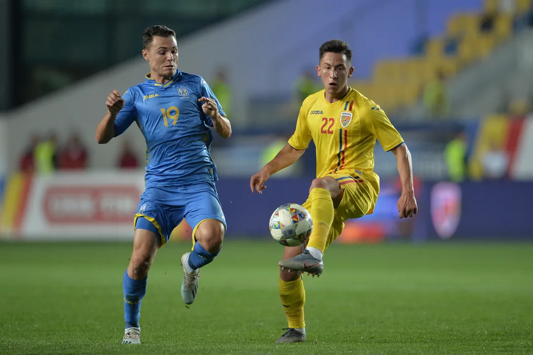 Olimpiu Morutan (D), de la Romania U21, suteaza in meciul de fotbal contra selectionatei Ucrainei U21 din preliminariile EURO 2021, disputat pe stadionul Ilie Oana din Ploiesti, joi, 10 octombrie 2019. ALEXANDRU DOBRE / MEDIAFAX FOTO