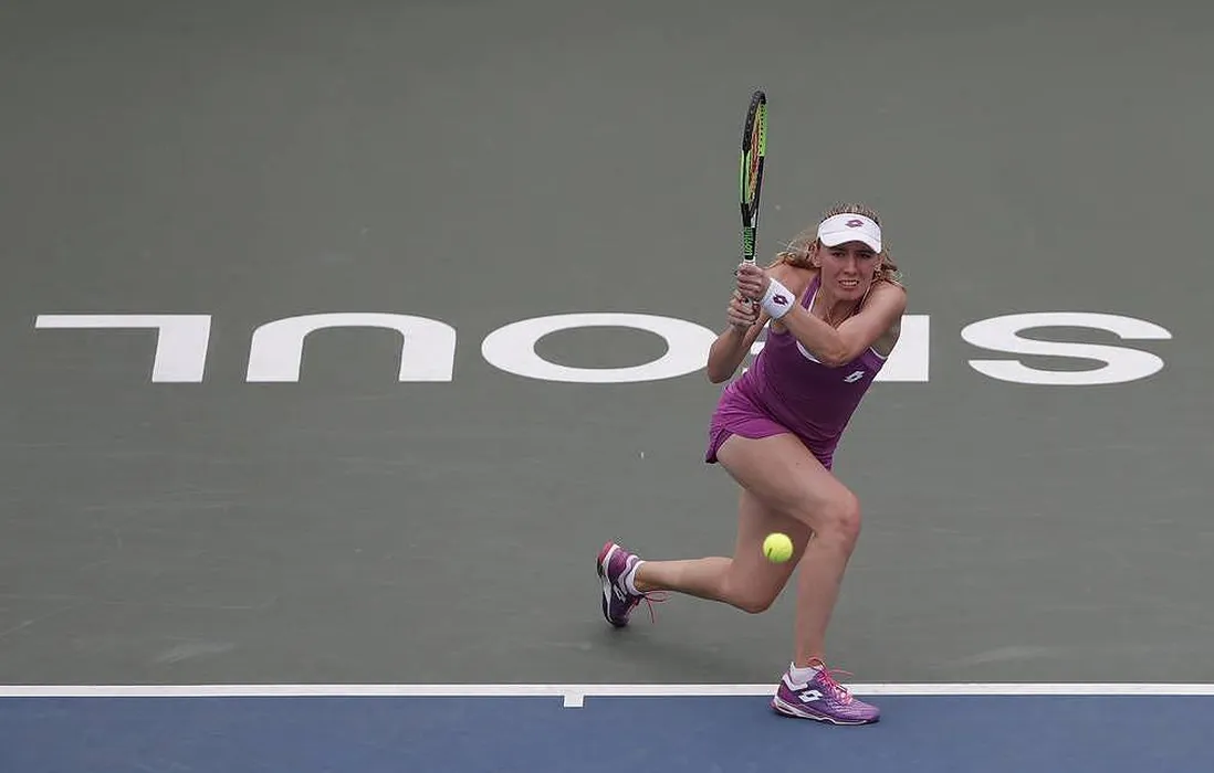Ekaterina Alexandrova of Russia returns a shot to Kristie Ahn of the United States during their quarterfinal match of the Korea Open tennis championships in Seoul, South Korea, Friday, Sept. 20, 2019. (AP Photo/Lee Jin-man)
