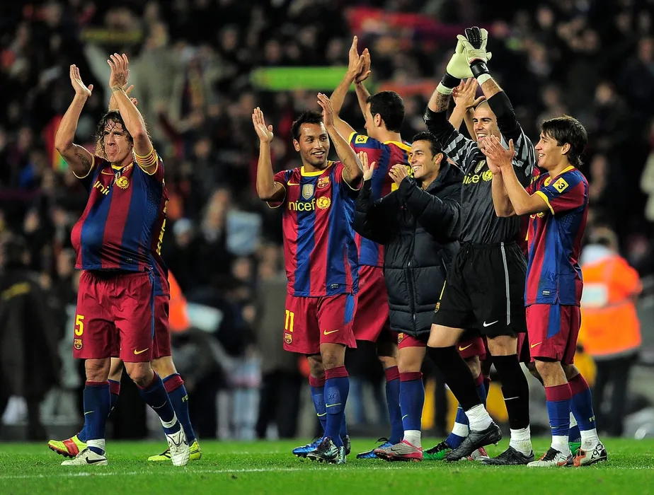 Barcelona's captain Carles Puyol (L), Barcelona's forward Jeffren Suarez (2ndL) and Barcelona's goalkeeper Victor Valdes Arriba (2ndR) celebrate their victory with teammates at the end of the Spanish league "clasico" football match FC Barcelona vs Real Madrid on November 29, 2010 at Camp Nou stadium in Barcelona. Barcelona won 5-0., Image: 87951086, License: Rights-managed, Restrictions: , Model Release: no, Credit line: JOSEP LAGO / AFP / Profimedia