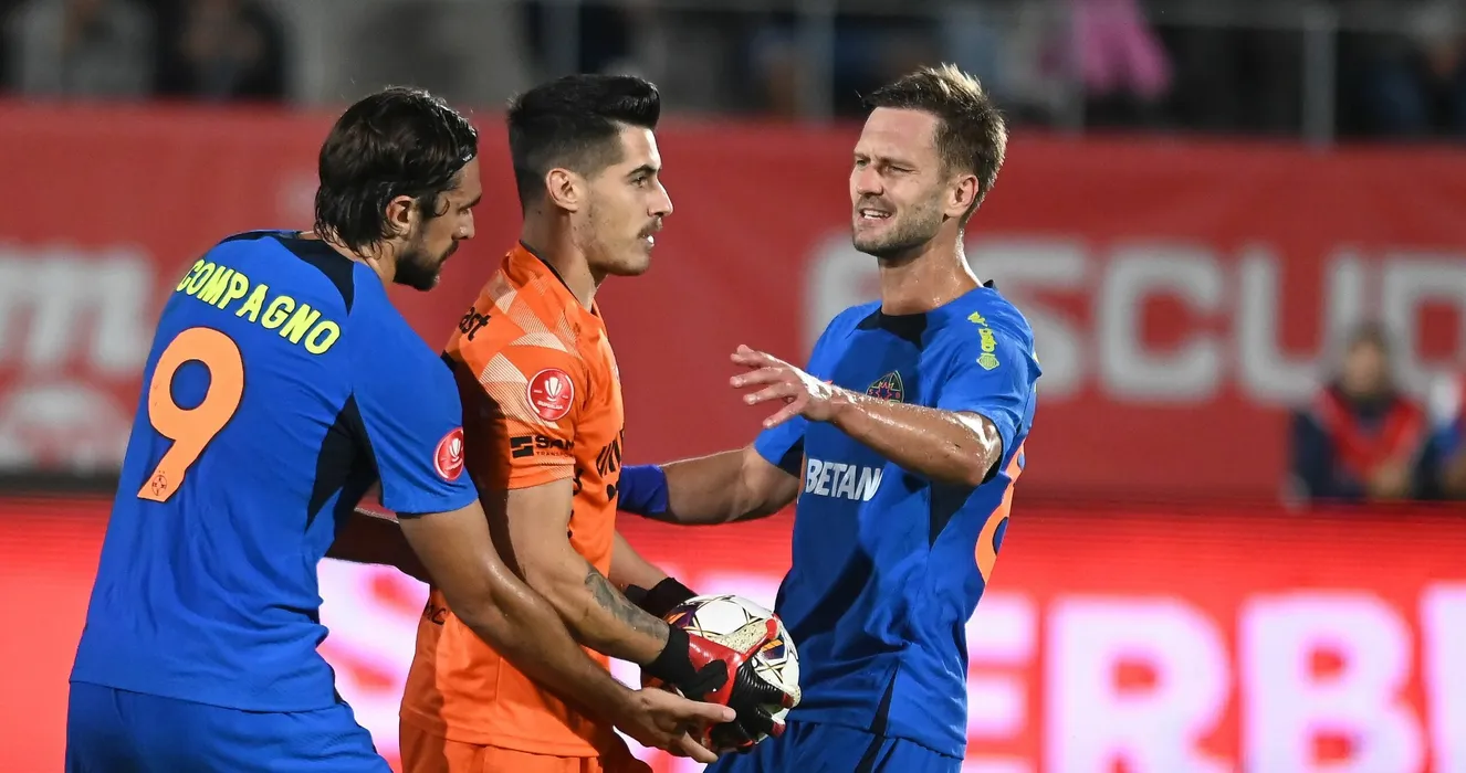 Andrea Compagno se bucura dupa un gol marcat alaturi de Damjan Djokovic spre dezamagirea lui Catalin Vasile Cabuz in meciul de fotbal dintre FC Hermannstadt si FCSB, contand pentru Superliga Superbet, desfasurat pe Stadionul Municipal din Sibiu, joi 21 septembrie 2023. © FOTO:Razvan Pasarica/SPORT PICTURES