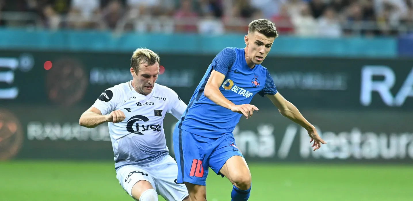 Kristoffer Lokberg si Octavian George Popescu in meciul de fotbal dintre FCSB si FK Viking Stavanger, din cadrul play-off-ului UEFA Europa Conference League, desfasurat pe Arena Nationala din Bucuresti, joi 18 august 2022. © FOTO:Razvan Pasarica/SPORT PICTURES