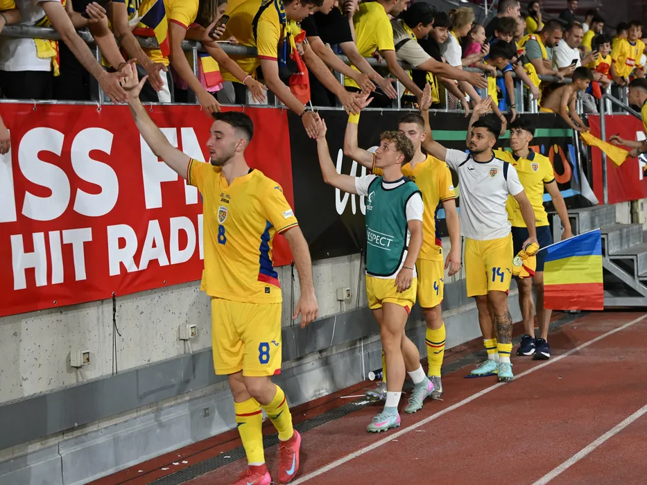 Fotbalistii romani Luca-Daniel Szimionaș, Răzvan-Alin Călugăr si Matei Marin saluta galeria dupa meciul de fotbal dintre Olanda U19 si Romania U19, contand pentru Campionatul European U19, desfasurat pe Stadionul Giulesti din Bucuresti, luni 23 iunie 2025. © FOTO:Razvan Pasarica/SPORT PICTURES
