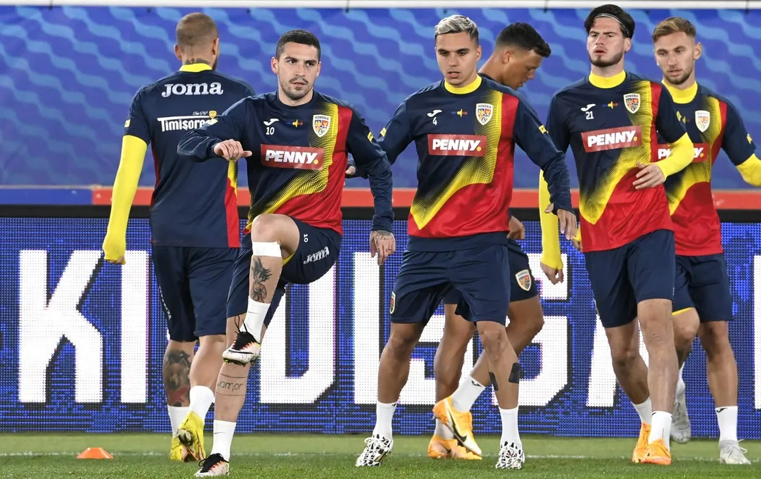 Nicolae Stanciu (2L) pictured during practice of team Romania on the eve of the UEFA Nations League football match between Finland and Romania in the Olympic Stadium in Helsinki, Finland, on September 22, 2022.