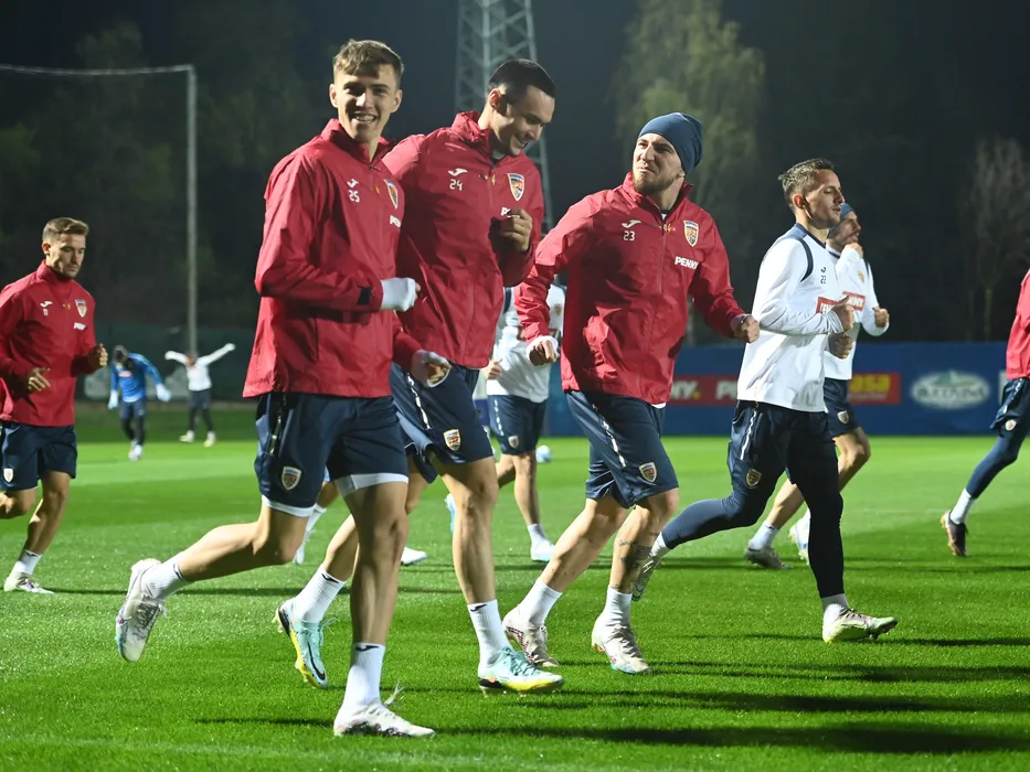 Fotbalistii romani Octavian Popescu, Adrian Sut, Deian Sorescu si Marius Stefanescu la antrenamentul oficial de dinaintea meciului impotriva Belarus, din cadrul preliminariilor Campionatului European 2024, desfasurat la Centrul National de Fotbal de la Mogosoaia, luni 27 martie 2023. © FOTO:Razvan Pasarica/SPORT PICTURES