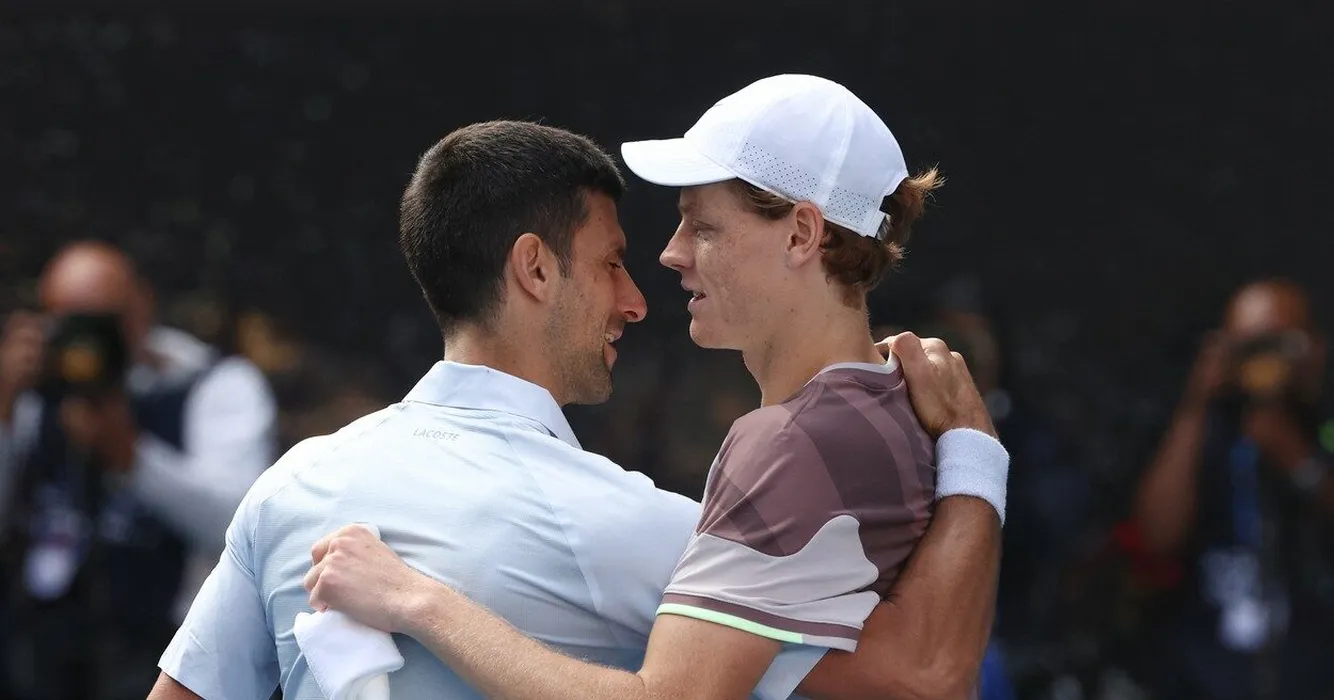 Italy's Jannik Sinner (R) is congratulated by Serbia's Novak Djokovic following his victory in their men's singles semi-final match on day 13 of the Australian Open tennis tournament in Melbourne on January 26, 2024.,Image: 840690126, License: Rights-managed, Restrictions: -- IMAGE RESTRICTED TO EDITORIAL USE - STRICTLY NO COMMERCIAL USE --, Model Release: no