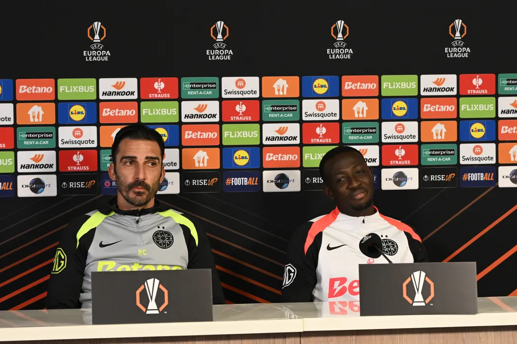 Elias Charalambous si Baba Alhassan la conferinta de presa a FCSB de dinaintea meciului impotriva echipei Feyenoord Rotterdam, din cadrul UEFA Europa League, desfasurata la Baza de antrenament FCSB din Bucuresti, miercuri 10 decembrie 2025. © FOTO:Razvan Pasarica/SPORT PICTURES