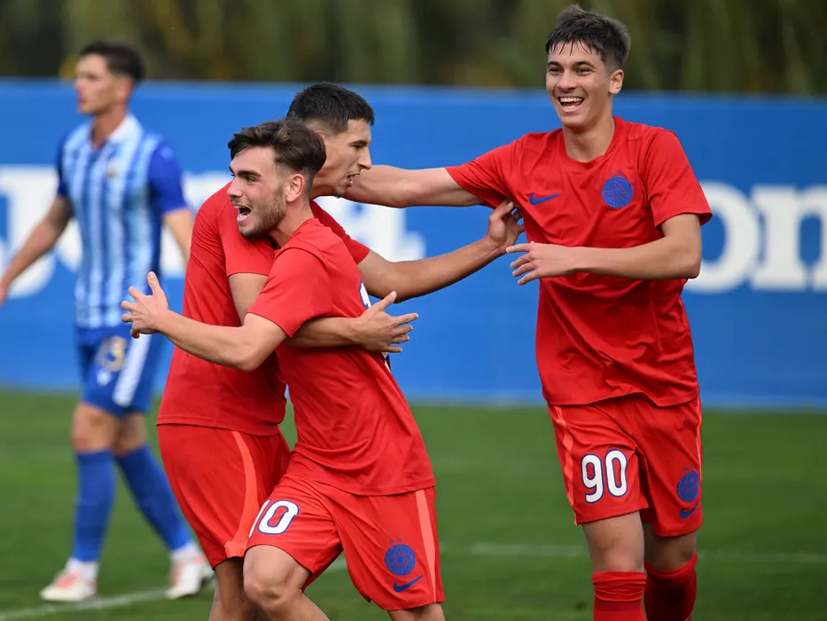 Bucurie a fotbalistilor ros-albastrii David Popa, Robert Necşulescu si Alexandru Stoian dupa un gol marcat in meciul de fotbal dintre FCSB U21 si Lokomotiva Zagreb U21, contand pentru UEFA Youth League, desfasurat pe Stadionul central de iarba din cadrul Centrului National de Fotbal de la Buftea, miercuri 5 noiembrie 2025. © FOTO:Razvan Pasarica/SPORT PICTURES