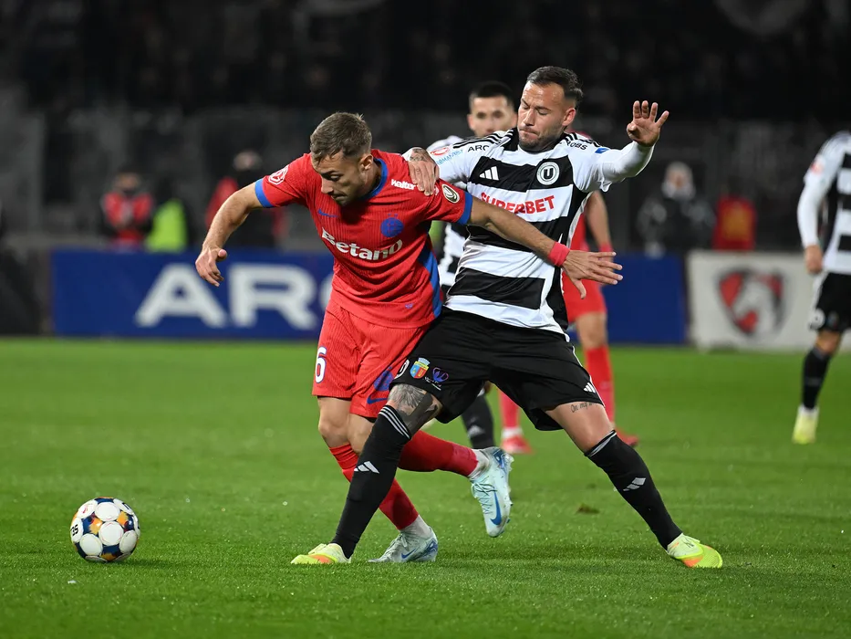 Mihai Daniel Lixandru si Alessandro Murgia în meciul de fotbal dintre Universitatea Cluj si FCSB, contând pentru Superliga Superbet, desfășurat pe Cluj Arena din Cluj Napoca, sambata 1 noiembrie 2025. © FOTO:Răzvan Pasarica/SPORT PICTURES