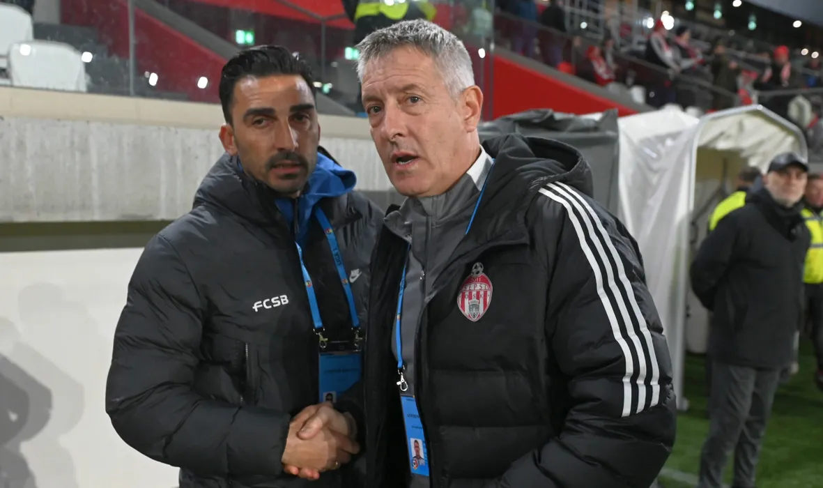 Cei doi antrenori Cristiano Bergodi si Elias Charalambous se saluta inaintea meciului de fotbal dintre Sepsi OSK Sfantu Gheorghe si FCSB, contand pentru Play-off-ul Superligii Superbet, desfasurat pe Sepsi Arena din Sfantu Gheorghe, luni 3 aprilie 2023. © FOTO:Razvan Pasarica/SPORT PICTURES