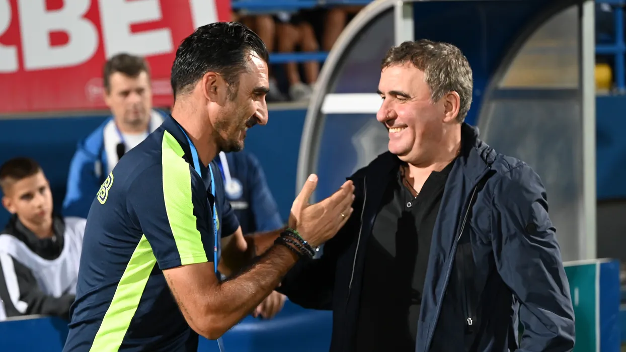 Cei doi antrenori Elias Charalambous si Gheorghe Hagi se saluta inaintea meciului de fotbal dintre Farul Constanta si FCSB, contand pentru Superliga Superbet, desfasurat pe Stadionul central al Academiei Gheorghe Hagi din Ovidiu, duminica 17 septembrie 2023. © FOTO:Razvan Pasarica/SPORT PICTURES