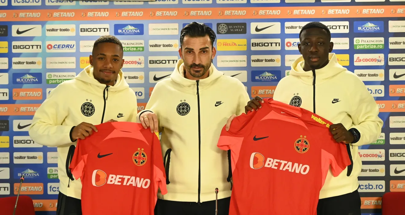 Luis Phelipe, Elias Charalambous si Baba Alhassan la o conferinta de presa desfasurata la Baza de antrenament FCSB din Bucuresti, luni 8 ianuarie 2024. © FOTO:Razvan Pasarica/SPORT PICTURES
