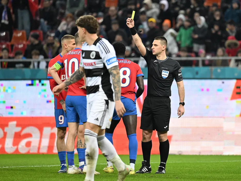 Arbitrul central Rares George Vidican acorda un cartonaș galben in meciul de fotbal dintre FCSB si Universitatea Cluj, contand pentru Superliga Superbet, desfasurat pe Arena Nationala din Bucuresti, sambata 7 martie 2026. © FOTO:Razvan Pasarica/SPORT PICTURES