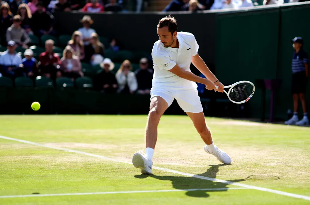06 July 2024, United Kingdom, London: Russian tennis player Daniil Medvedev plays a backhand return to Germany's Jan-Lennard Struff during their Men's singles third round tennis match on day six of the 2024 Wimbledon Championships at the All England Lawn Tennis and Croquet Club. Photo: John Walton/PA Wire/dpa