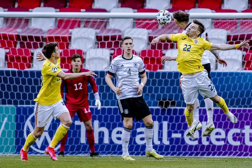 Darius Olaru (S), de la nationala de fotbal a Romaniei U21, lupta sa inscrie in timpul meciului Romania U21 - Germania U21 din ultima runda a grupelor de la Campionatul European de tineret, disputat pe stadionul Bozsik din Budapesta, marti, 30 martie 2021. VIORICA PANA / MEDIAFAX FOTO