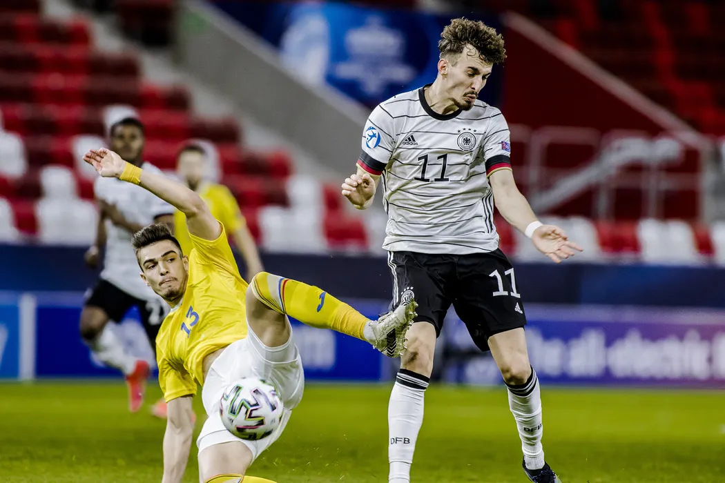 Darius Ciobotariu (S), de la Romania U21, lupta pentru balon cu Mergim Berisha (D), de la Germania U21 in meciul de fotbal din ultima runda a grupelor de la Campionatul European de tineret, disputat pe stadionul Bozsik din Budapesta, marti, 30 martie 2021. VIORICA PANA / MEDIAFAX FOTO