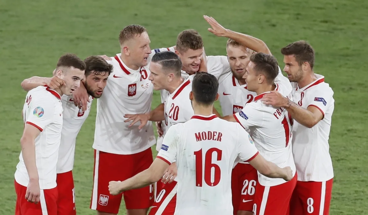 Poland's players react after the Euro 2020 soccer championship group E match between Spain and Poland at Estadio de la Cartuja stadium in Sevilla, Spain, Saturday, June 19, 2021. (Jose Manuel Vidal/Pool via AP)