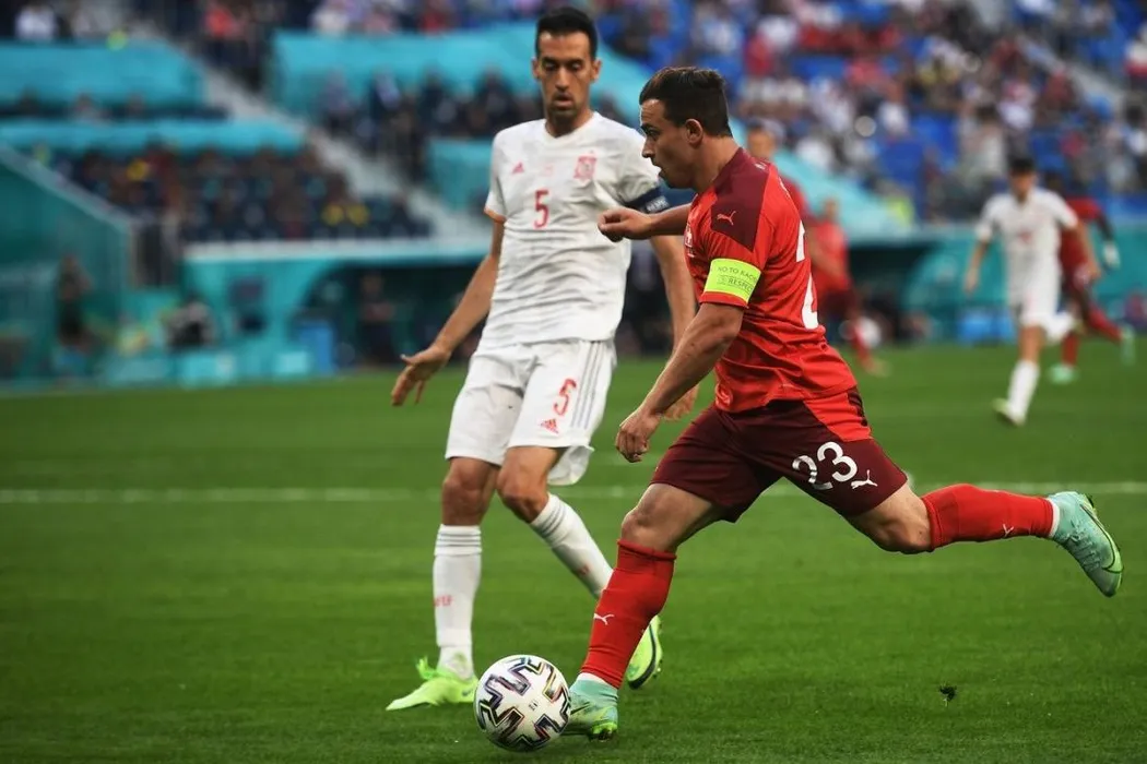 6587590 02.07.2021 Switzerland's Xherdan Shaqiri, right, and Spain's Sergio Busquets struggle for a ball during the Euro 2020 quarterfinal soccer match between Switzerland and Spain, in Saint Petersburg, Russia.,Image: 619267292, License: Rights-managed, Restrictions: , Model Release: no, Credit line: Profimedia