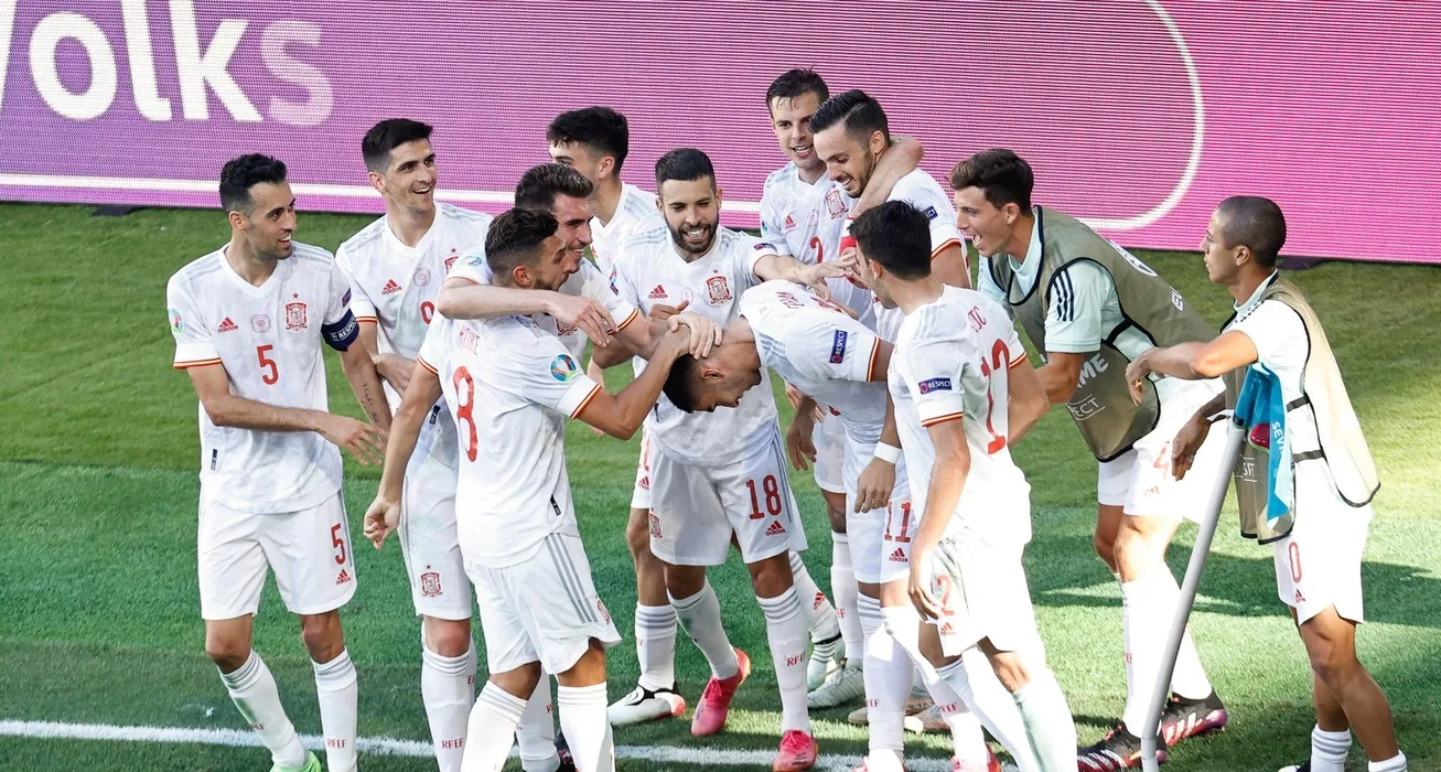 Ferran Torres of Spain celebrates a goal with teammates during the UEFA EURO 2020 Group E football match between Slovakia and Spain at La Cartuja stadium on June 23, 2021 in Seville, Spain.