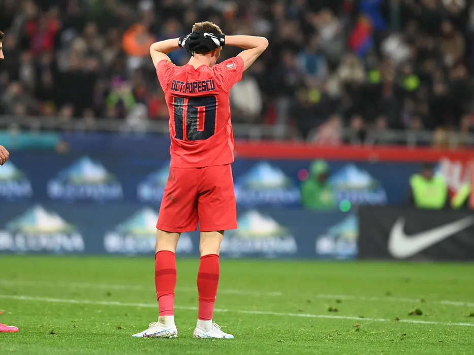 Octavian George Popescu isi pune mainile pe cap dupa o ratare avuta in meciul de fotbal dintre FCSB si Sepsi OSK Sfantu Gheorghe, contand pentru Superliga Superbet, desfasurat pe Arena Nationala din Bucuresti, duminica 12 martie 2023. © FOTO:Razvan Pasarica/SPORT PICTURES