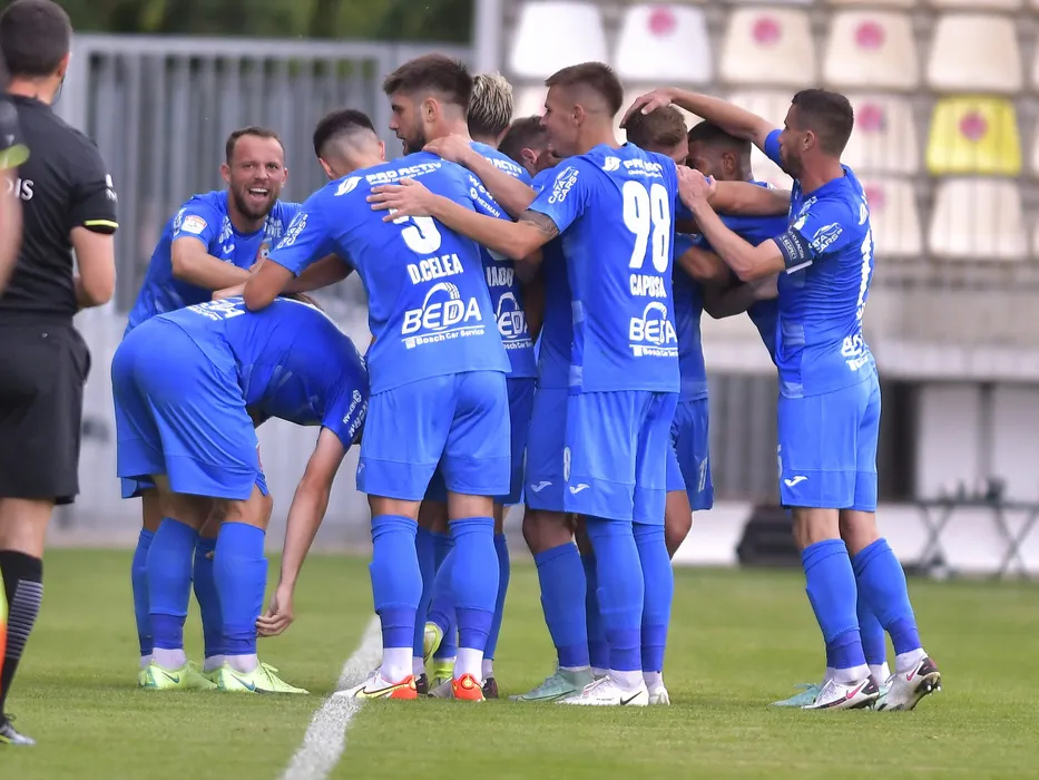 Bucurie a fotbalistilor targovisteni dupa un gol marcat cu Cristian Daniel Negut, Paul Alexandru Iacob si Tiberiu Ionut Capusa la meciul de fotbal dintre Chindia Targoviste si Farul Constanta, contand pentru Liga 1 Casa Pariurilor, desfasurat pe Stadionul Ilie Oana din Ploiesti, sambata 18 septembrie 2021. © FOTO:Razvan Pasarica/SPORT PICTURES