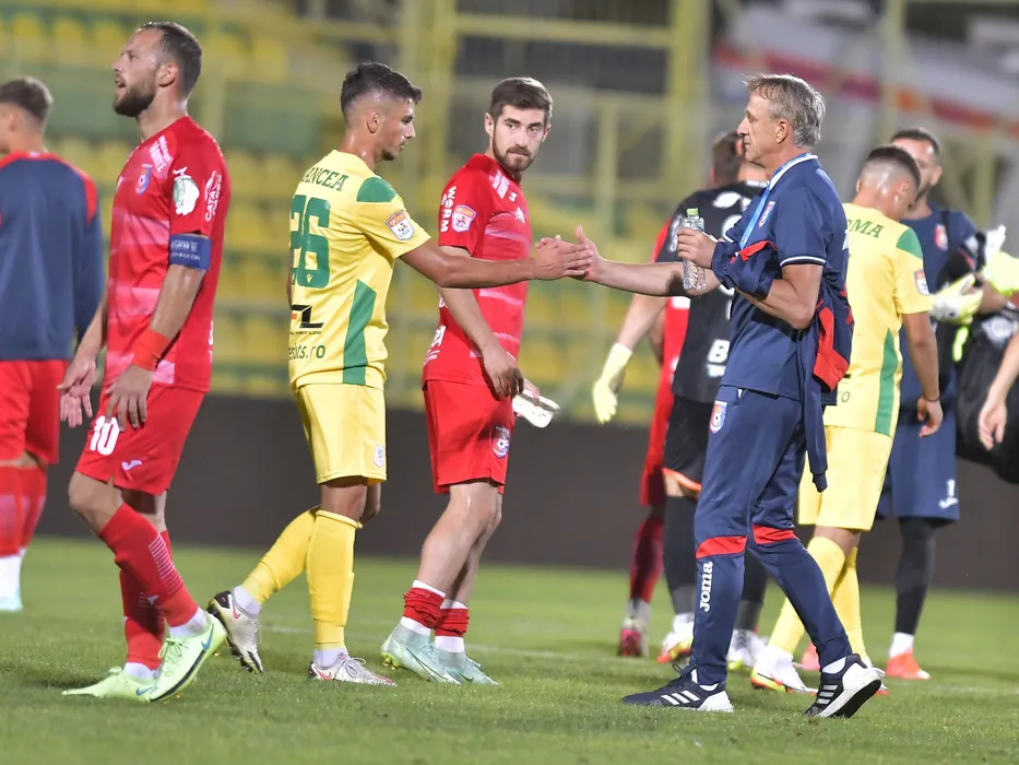 Gabriel Dorinel Oancea, Doru Popadiuc si Emil Sandoi se saluta dupa meciul de fotbal dintre CS Mioveni si Chindia Targoviste, contand pentru Liga 1 Casa Pariurilor, desfasurat pe Stadionul Orasenesc din Mioveni, vineri 10 septembrie 2021. © FOTO:Razvan Pasarica/SPORT PICTURES