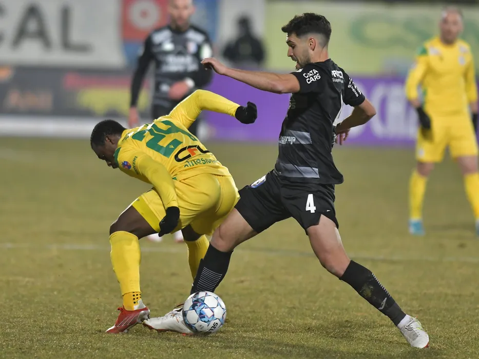 Moussa Sanoh si Juan Pablo Passaglia in meciul de fotbal dintre CS Mioveni si Chindia Targoviste, contand pentru Play-out-ul Ligii 1 Casa Pariurilor, desfasurat pe Stadionul Orasenesc din Mioveni, luni 21 martie 2022. © FOTO:Razvan Pasarica/SPORT PICTURES