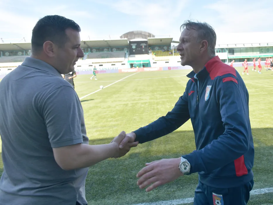 Cei doi antrenori Ianis Zicu si Emil Sandoi se saluta inaintea meciului de fotbal dintre Concordia Chiajna si Chindia Targoviste, contand pentru Barajul pentru Liga 1 Casa Pariurilor, desfasurat pe Stadionul comunal Concordia din Chiajna, sambata 21 mai 2022. © FOTO:Razvan Pasarica/SPORT PICTURES