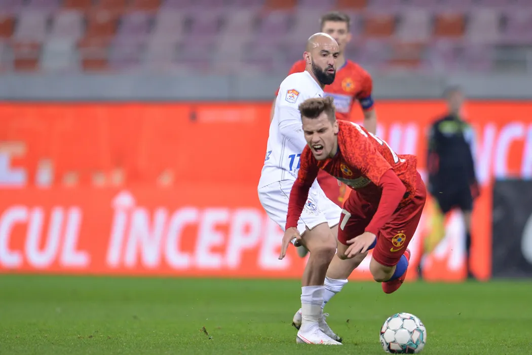 Darius Olaru (D), de la FCSB, lupta pentru balon cu Gabriel de Moura (S), de la Gaz Metan Medias, in meciul de fotbal din etapa a XXVI-a a Ligii 1, disputat pe Arena Nationala din Bucuresti, duminica, 7 martie 2021. ALEXANDRU DOBRE / MEDIAFAX FOTO