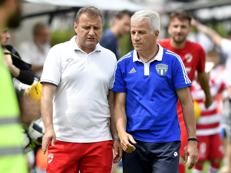 Emil Ursu si Marin Duna discuta dupa meciul de fotbal dintre Dinamo Bucuresti si Progresul Bucuresti, din cadrul barajului de promovare pentru Liga a-3-a, desfasurat pe Stadionul Regie-Sportul Studentesc din Bucuresti, dminica 2 iunie 2019. © FOTO:Razvan Pasarica/SPORT PICTURES
