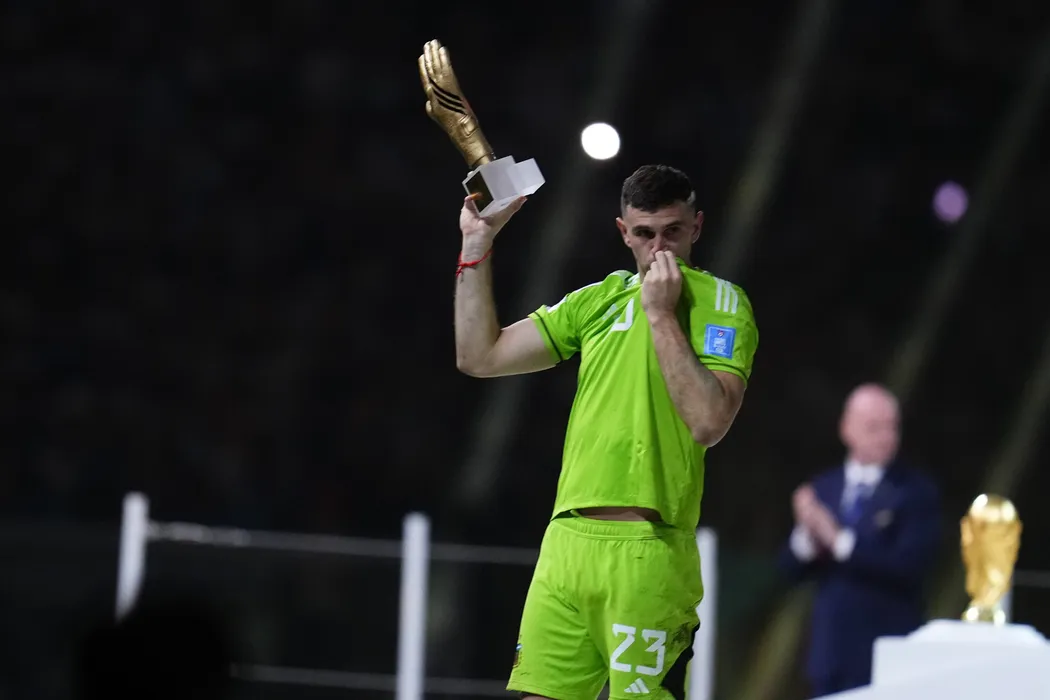 Argentina's goalkeeper Emiliano Martinez holds the Golden Glove award for best goalkeeper of the tournament during the awards ceremony after Argentina defeated France in World Cup final soccer match at the Lusail Stadium in Lusail, Qatar, Sunday, Dec. 18, 2022. (AP Photo/Natacha Pisarenko)